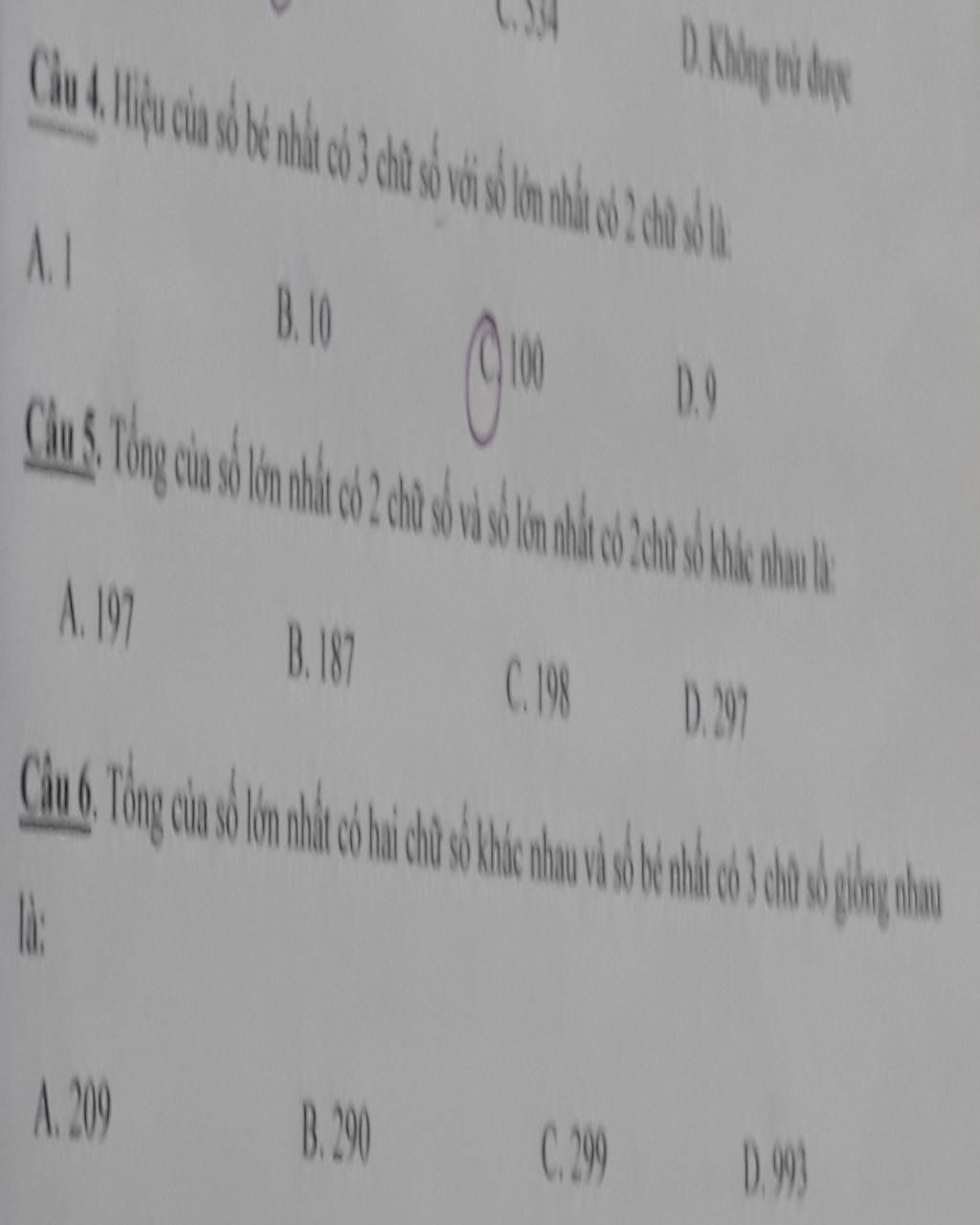 Câu 6: số lớn nhất có 2 chữ số khác nhau là 98 và số bé nhất có 3 chữ số giống nhau là 111 đề yêu cầu tính tổng nên ta lấy 111+98=209