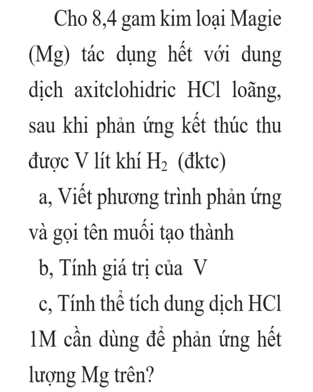 c) $n_{HCl}$ = 2$n_{Mg}$ = 2. 0,35 = 0,7 (mol)