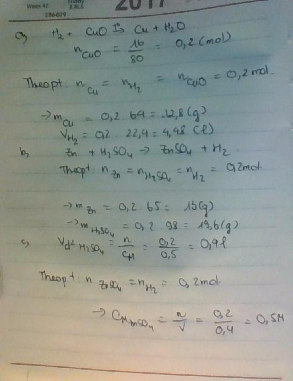 a) $n_{CuO}$ = `16/80` = 0,2 (mol)