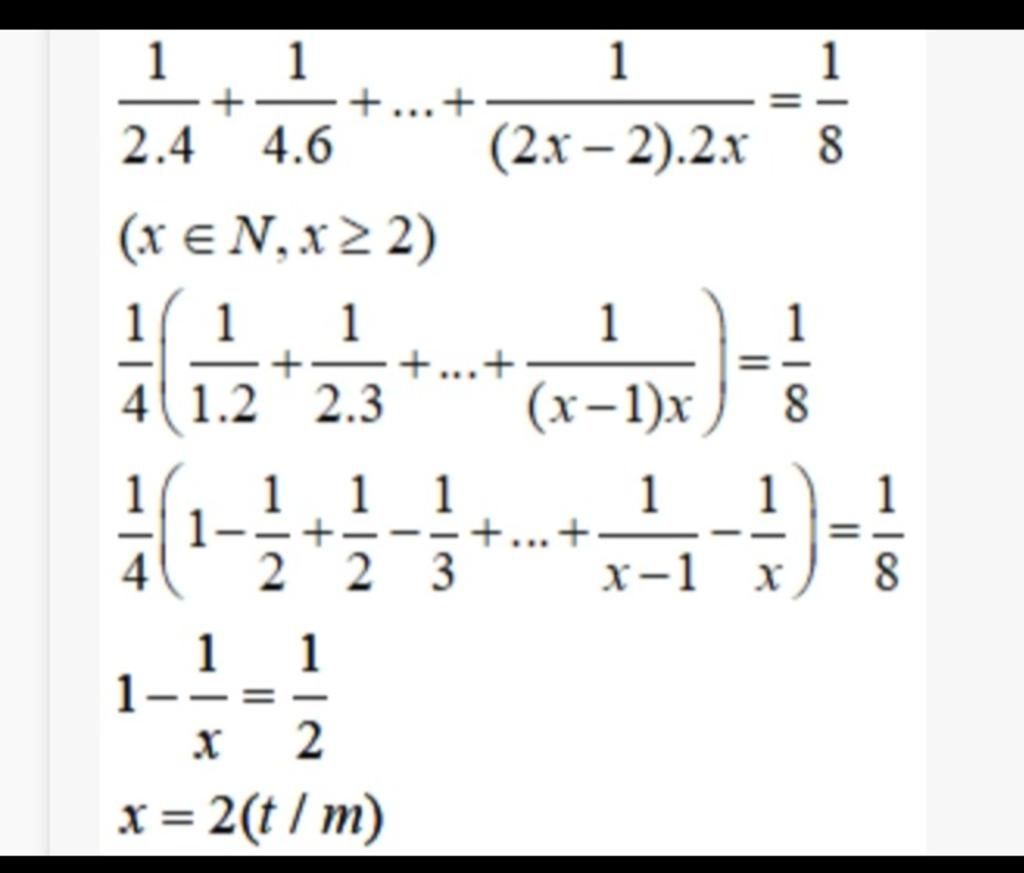 `1/(2.4) + 1/(4.6) + ... + 1/((2x-2)(2x)) = 1/8`.