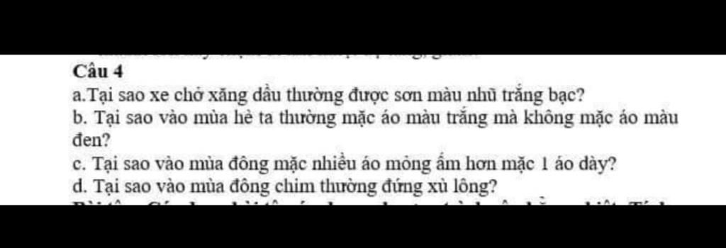 b. Về mùa hè thường mặc áo màu trắng để giảm hấp thụ nhiệt làm cho ta nóng do vật màu trắng sáng hấp thụ nhiệt kém.