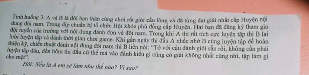 Nếu là A em sẽ khuyên bạn B nên từ bỏ suy nghĩ lạc quan đó và cùng tích cực luyện tập. Vì không phải tất cả đều tự nhiên mà có, đều phải trải qua những quá trình luyện tập chăm chỉ và cố gắng để đạt hiệu quả tốt nhất, trong khi mình cảm thấy mình đang giỏi và không cần phải luyện tập thêm thì lúc đó, đối thủ của ta đang chăm chỉ luyện tập và ngày càng giỏi hơn rất nhiều. Nếu chỉ ỷ lại vào những thành tích trước mà không phấn đấu cố gắng hơn thì đã thua thiệt đối thủ hiện tại rất nhiều.