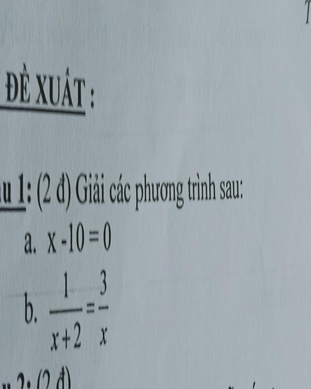 `b,` `1/(x + 2) = 3/x` (ĐK: `x \ne -2; x \ne 0`)