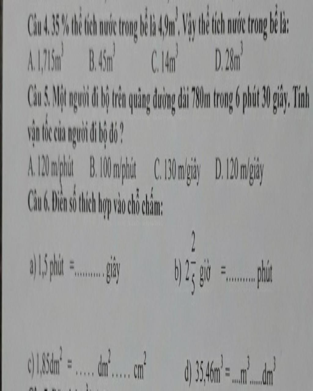 Câu 4 : 35% thể tích nước trong bể là 4,9 m3. Vậy thể tích nước trong bể là :