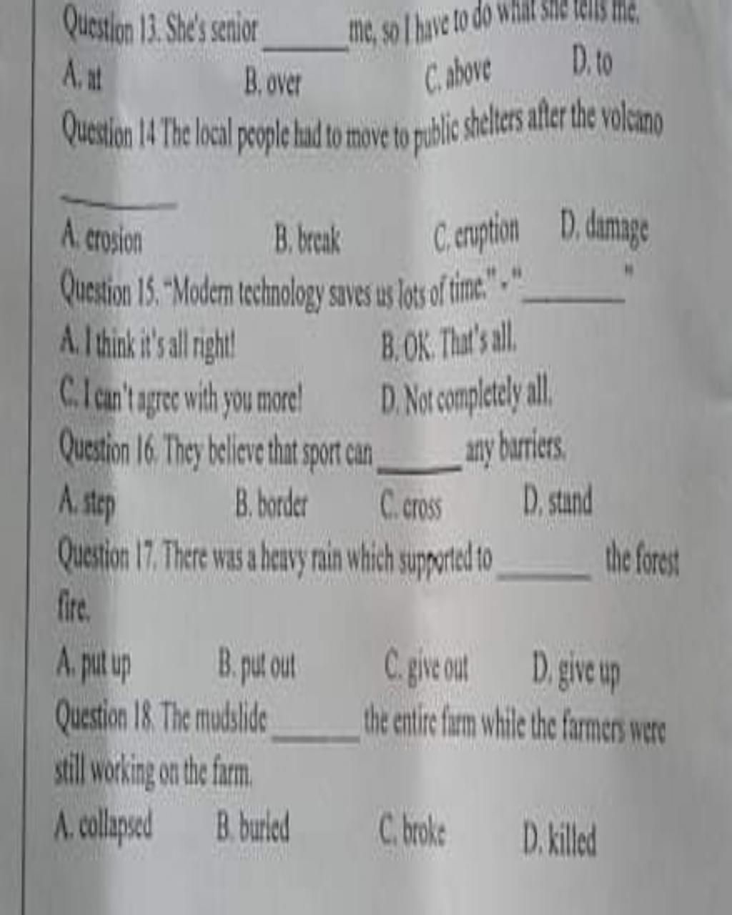 14.C (volcano eruption: Sự phun trào núi lửa) 15. A. (I think it is all right: Tôi nghĩ nó đúng tất ) 16. C (cross any barrier: băng qua mọi rào cản) 17. B (put out: dập tắt) 18. B (bury : chôn vùi)