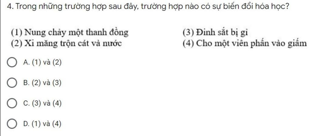 Giải thích: Vì sự biến đổi hóa học là sự biến đổi chất này thành chất khác, trong đây chỉ có trường hợp 1 và 2 có sự biến đổi hóa học