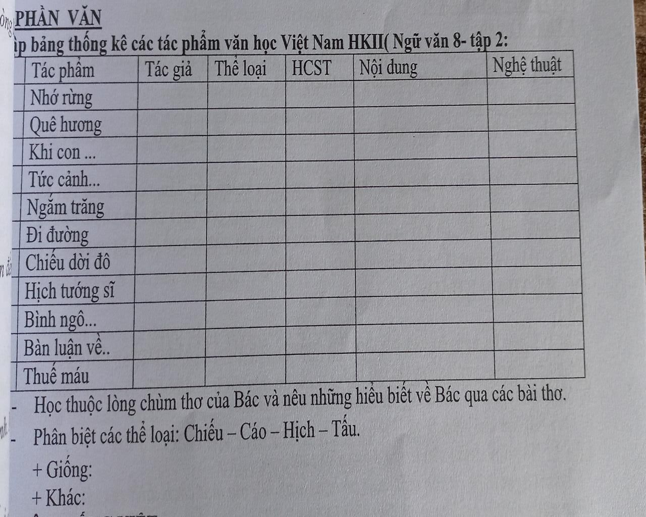lập bảng thống kê các tác phẩm văn học VN HKII