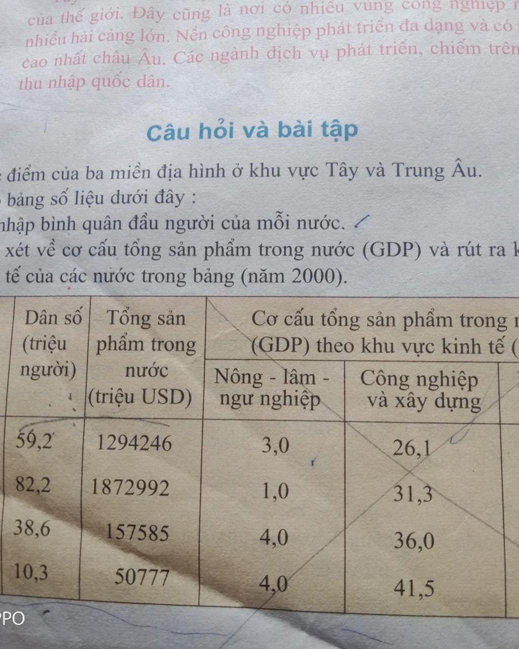 + Trong cơ cấu tổng sản phầm trong nước GDP của Pháp, Đức, Ba Lan, CH Séc, chiếm tỉ trọng cao nhất là khu vực dịch vụ và thấp nhất là khu vực nông – lâm – ngư nghiệp.