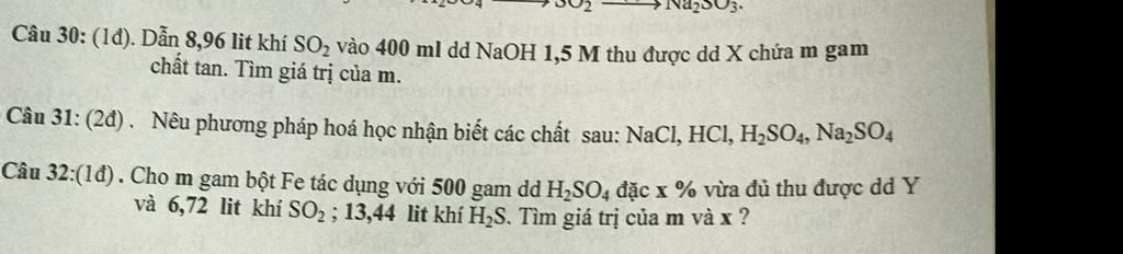 Câu 30: (1đ). Dẫn 8,96 lit khí SO, vào 400 ml dd NAOH 1,5 M thu được dd X chứa m gam