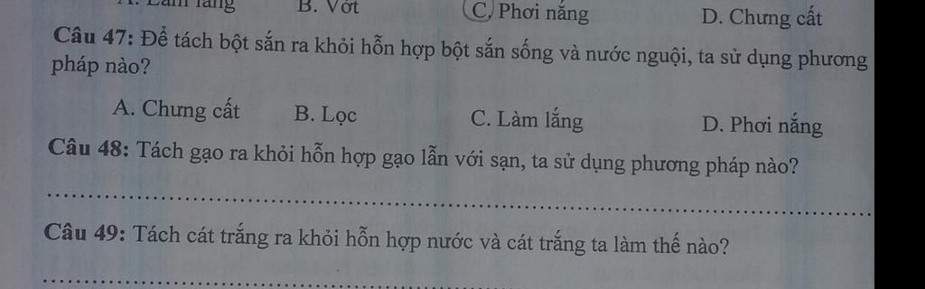 48.Đổ hỗn hợp gạo lẫn sạn vào rá. Đãi gạo trong chậu nước sao cho các hạt sạn lắng dưới đáy rá, bốc gạo ở phía trên ra, còn lại sạn ở dưới.