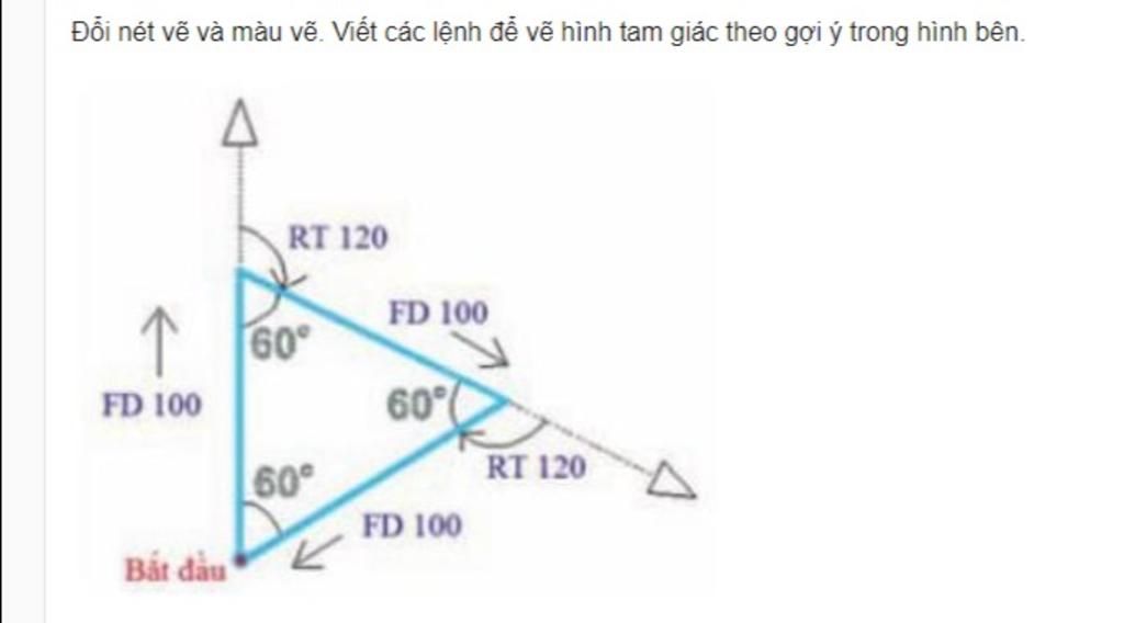 2. Bước 1 vẽ hình tam giác: repeat 3 [ fd 100 rt 120 ]