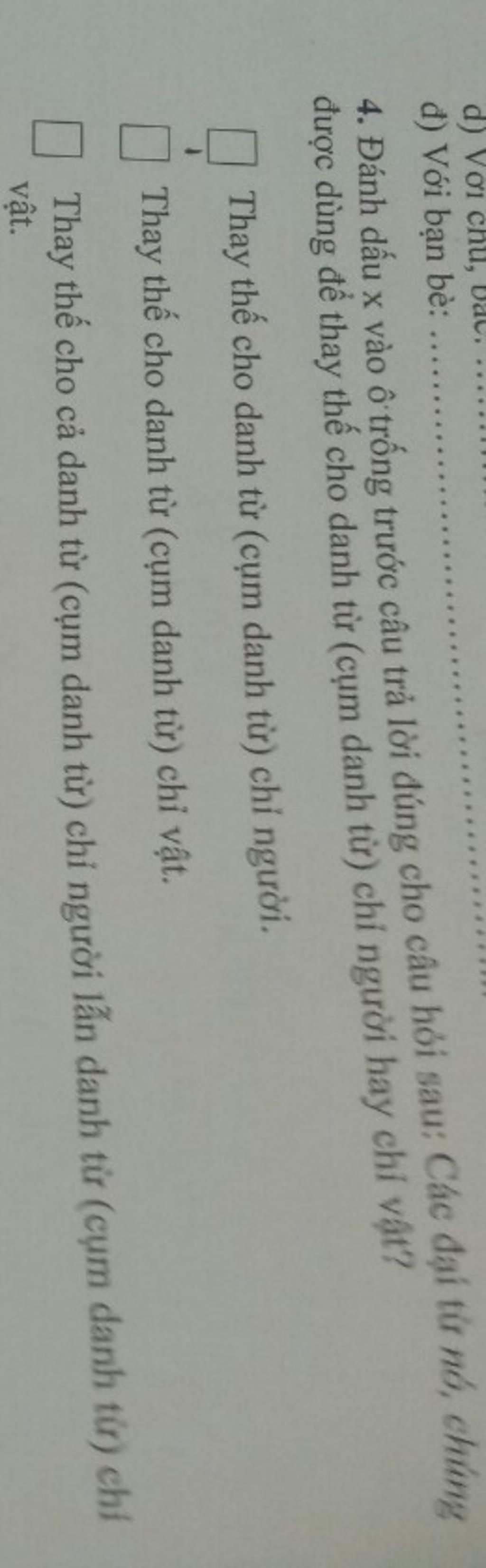 4. Đánh dấu x vào ô trống trước câu trả lời đúng cho câu hỏi sau: Các dại tu nó, chúng