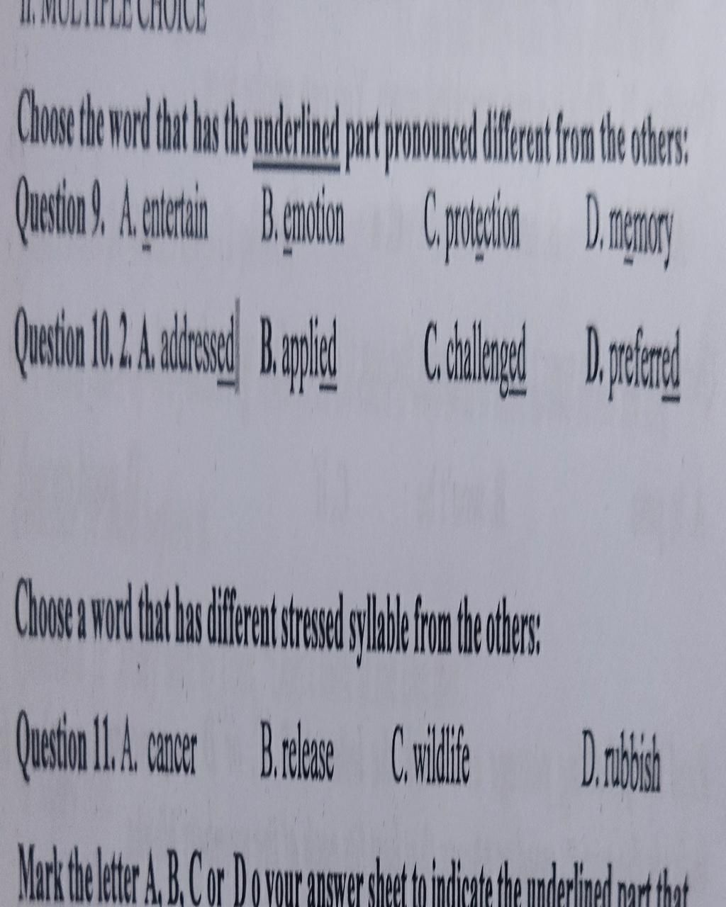 ` Q10 ` . A ( Addressed phát âm /t/ , ` 3 ` từ còn lại phát âm /d/ )