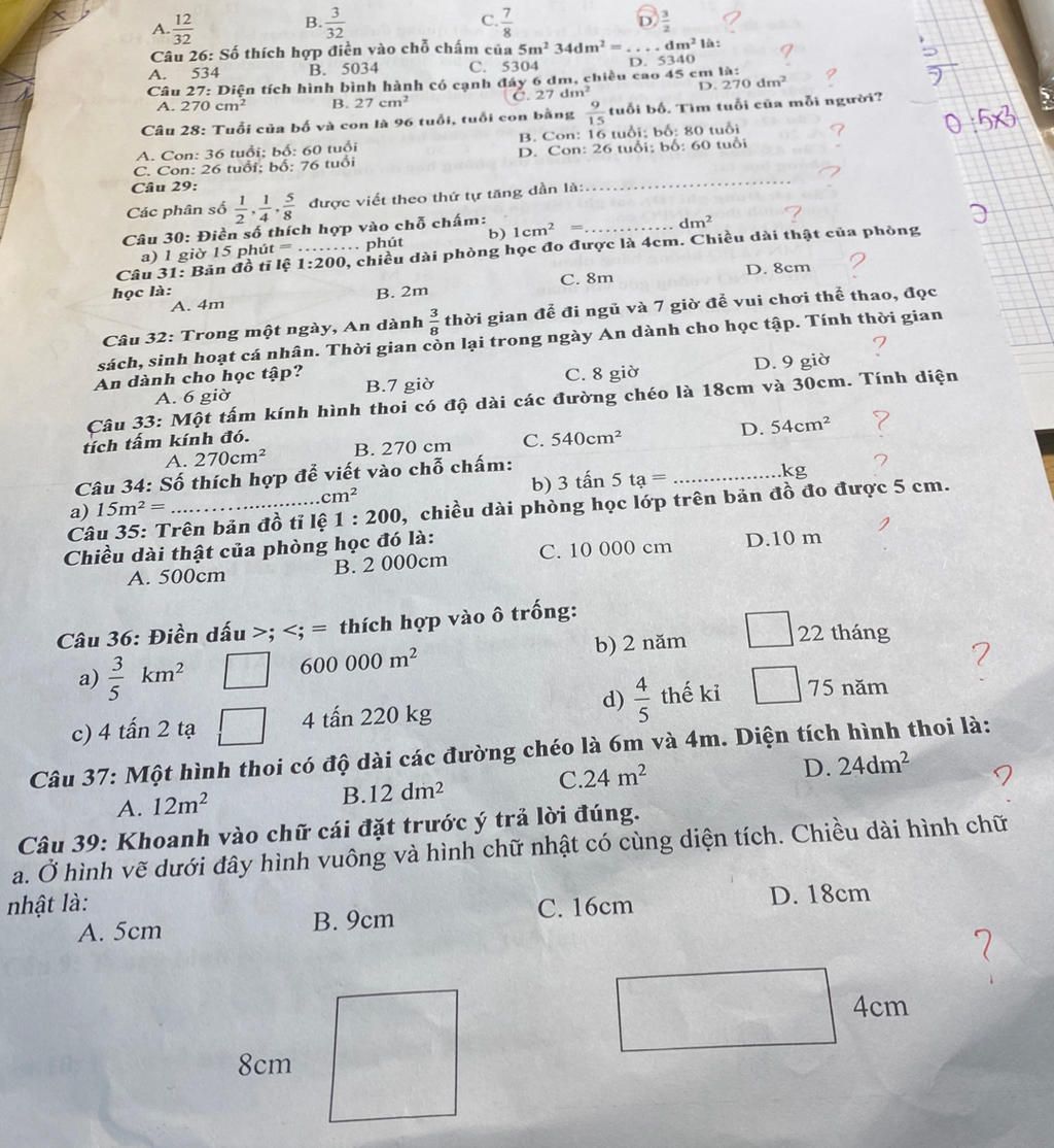 Câu 26: Số thích hợp điền vào chỗ chấm của 5m 34dm2 =