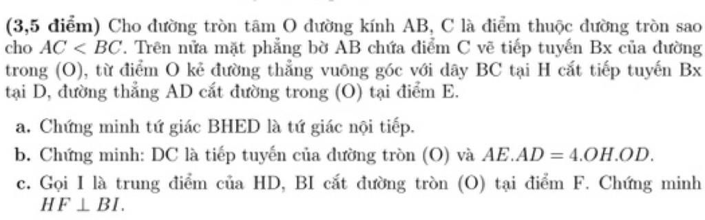 trong (O), từ điểm O kẻ đường thẳng vuông góc với dây BC tại H cắt tiếp tuyến Bx