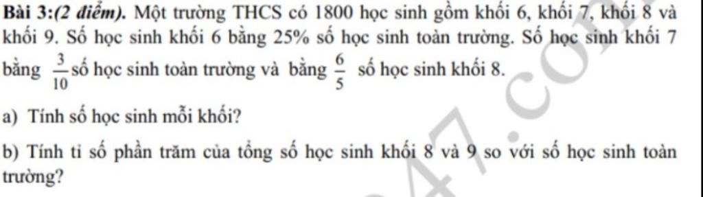 Tỉ số phần trăm của tổng số học sinh khối `8` và `9` so với số học sinh toàn trường là :