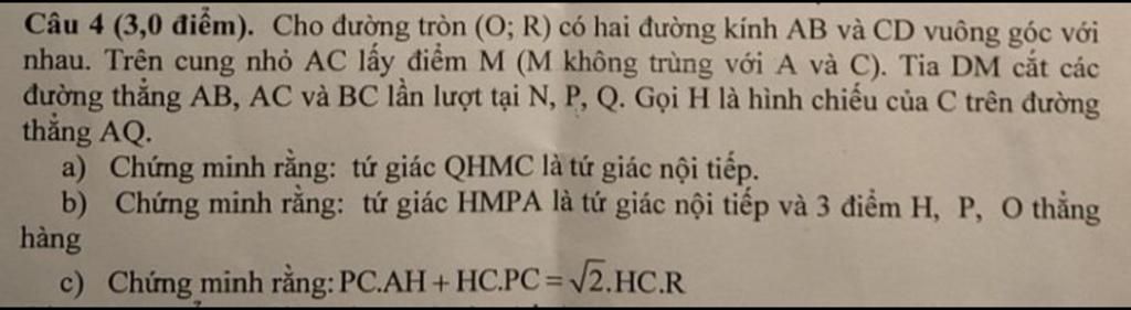 Câu 4 (3,0 điểm). Cho dưong tròn (O; R) có hai đưong kính AB và CD vuông góc với