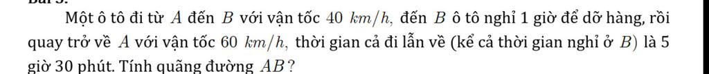 Thời gian ô tô đi từ `A ->B` là `x/40` ( h )