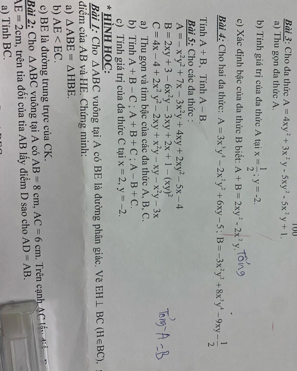 Bài 4: Cho hai đa thức: A = 3x'y- 2x'y +6xy- 5; B=-3x'y' +8x’y* -9xy-