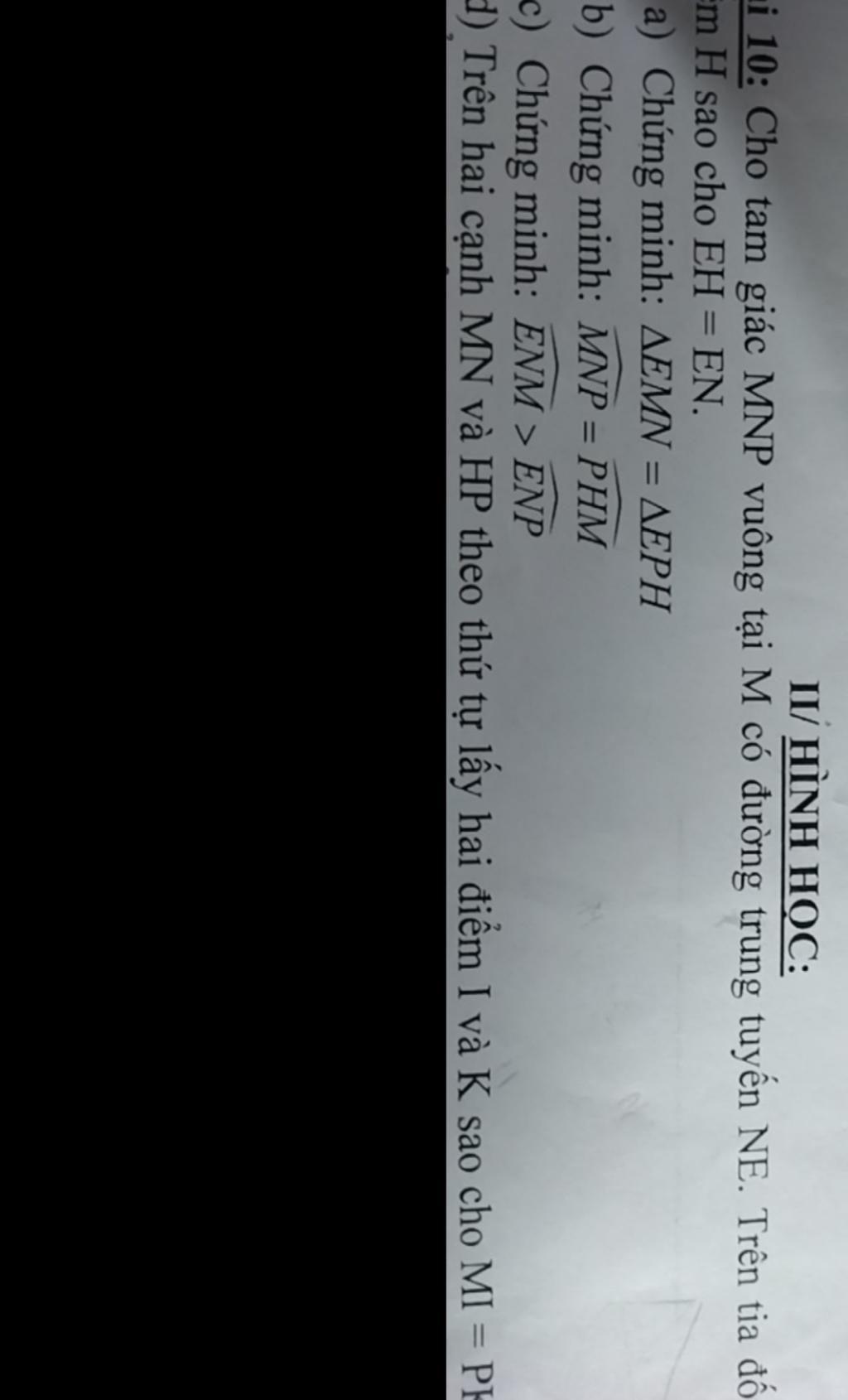 i 10: Cho tam giác MNP vuông tại M có đường trung tuyến NE. Trên tia đố