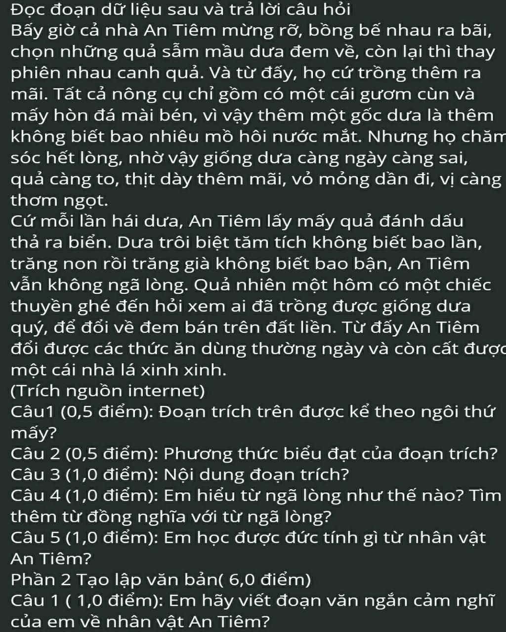 Câu 3: Nội dung đoạn trích: Kể về sự tích trái dưa hấu và cuộc sống của Mai An Tiêm chăm sóc và đạt được quả ngọt từ việc trồng dưa hấu.