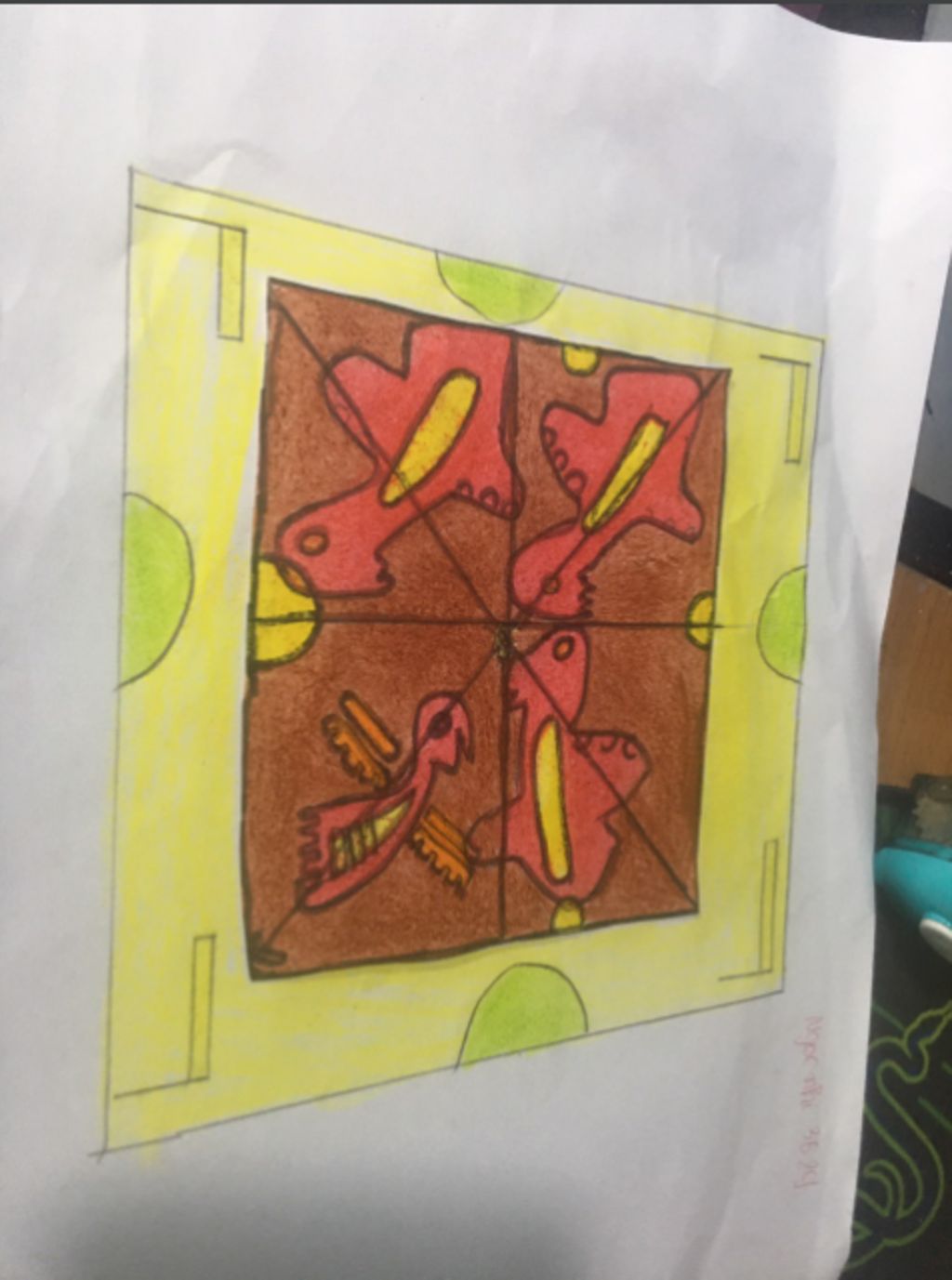 `\text{Bức 1:Vẽ trang trí hình vuông với họa tiết trống đồng.}`