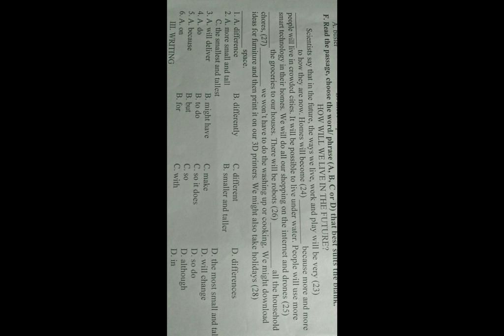 Scientists say that in the future, the ways we live, work and play will be very (23) __________ to how they are now. Homes will become (24) __________ because more and more people will live in crowded cities. It will be possible to live under water. People will use more smart technology in their homes. We will do all our shopping on the internet and drones (25) __________ the groceries to our houses. There will be robots (26) __________ all the household chores, (27) __________ we won’t have to do the washing up or cooking. We might download ideas for furniture and then print it on our 3D printers. We might also take holidays (28) __________ space.