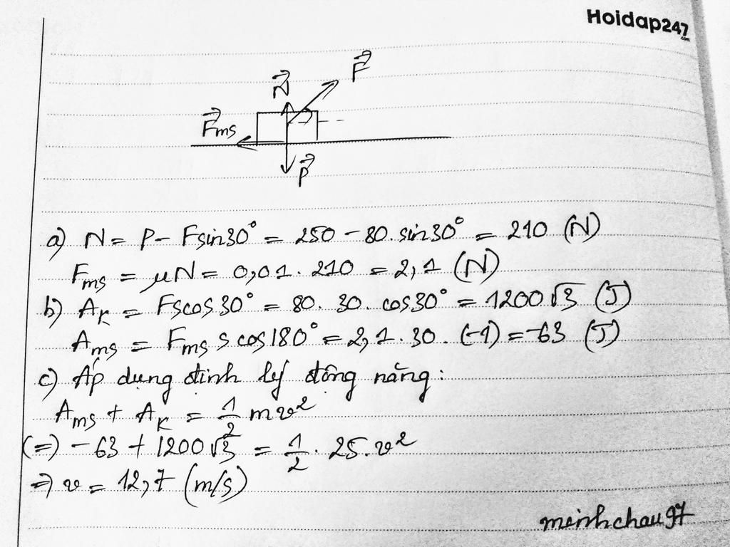 Một hành khách bắt đầu kéo một vali nặng 25 kg đi trong sân bay trên quãng đường dài 30 m với lực kéo có độ lớn 80 N hợp với phương ngang một góc 30°. Hệ số ma sát giữa vali và mặt đường là 0,01. Cho g= 10m/s². Hãy xác định: