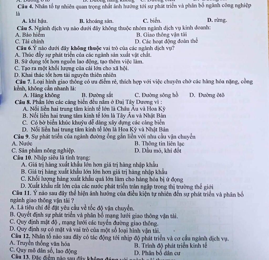 Câu 4. Nhân tố tự nhiên quan trọng nhất ảnh hưởng tới sự phát triển và phân bố ngành công nghiệp