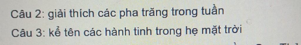 - Các hành tinh trong hệ Mặt Trời là: Thuỷ tinh, Kim tinh, Trái Đất, Hoả tinh, Mộc tinh, Thổ tinh, Thiên Vương tinh, Hải Vương tinh.