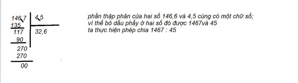 vì `146,7 : 4,5 = 1467 : 45` nên ta đặt tính như sau: (dưới ảnh)