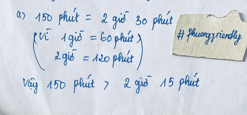 Vì `150` phút `>135` phút nên `150` phút `>2` giờ `15` phút.