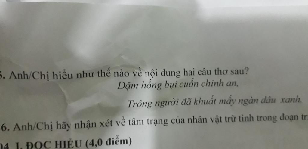 Câu thơ ""Dặm hồng bụi cuốn chinh an/Trông người đã khuất mấy ngàn dâu xanh" là câu thơ tả cảnh Thúc Sinh từ biệt Thúy Kiều để trở lại quê nhà. "Dặm hồng" ở đây chỉ con đường trở về xa tít tắp, bụi cuốn chinh an thể hiện sự chia cắt đầy lưu luyến. Mấy ngàn dâu xanh là cách nói ước lệ tượng trưng trong thơ văn trung đại để chỉ sự xa cách nghìn trùng. Hai câu thơ thể hiện cuộc chia ly và tâm trạng lo lắng, bất an của nhân vật trữ tình.