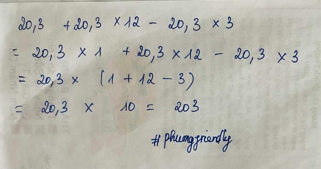 20,3 + 20,3 × 12 - 20,3 × 3 = 20,3 × 1 + 20,3 × 12 - 20,3 × 3 = 20,3 ( 1 + 12 - 3 ) = 20,3 × 10 = 203