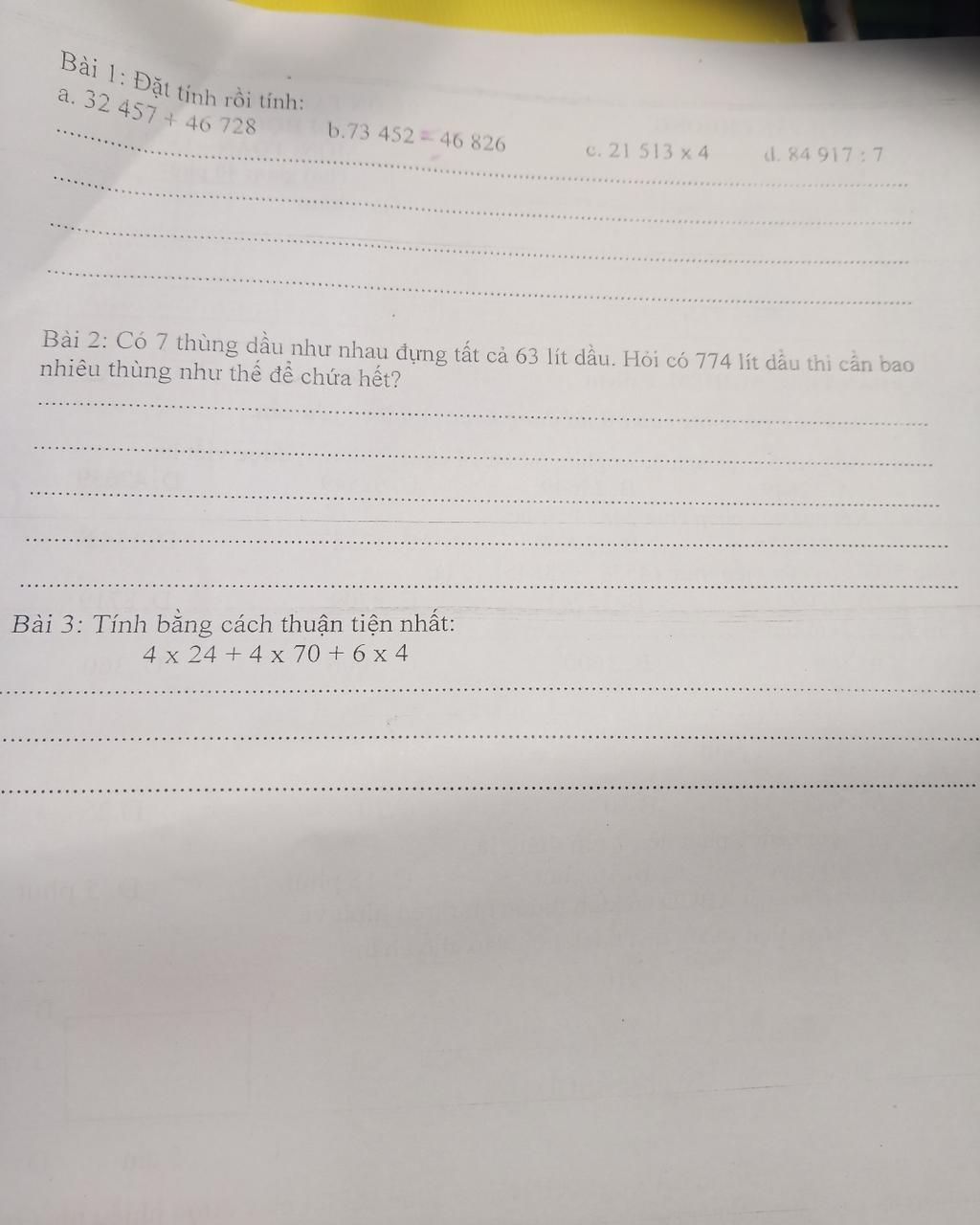 Bài 2: Có 7 thùng dâu nhưr nhau đựng tất cả 63 lít dầu. Hỏi có 774 lít dầu thi cần bao