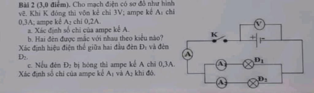 a. Ampe kế $A$ đo cường độ dòng điện chạy qua mạch chính; Ampe kế$A_1$ đo cường độ dòng điện chạy qua bóng đèn$Đ_1$, Ampe kế$A_2$ đo cường độ dòng điện chạy qua bóng đèn$Đ_2$. Ta có: