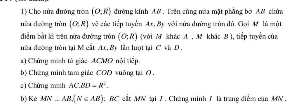 nửa đường tròn (0;R) vẽ các tiếp tuyến Ax, By với nửa đường tròn đó. Gọi M là một