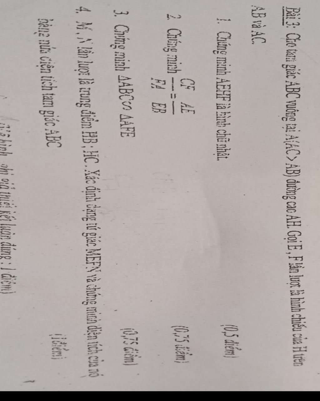 Bai 3: Cho tan giác ABC vuông tại A/AC > AB) dường cao AH. Goi E,F ln lợ à hình chiếu của H uên