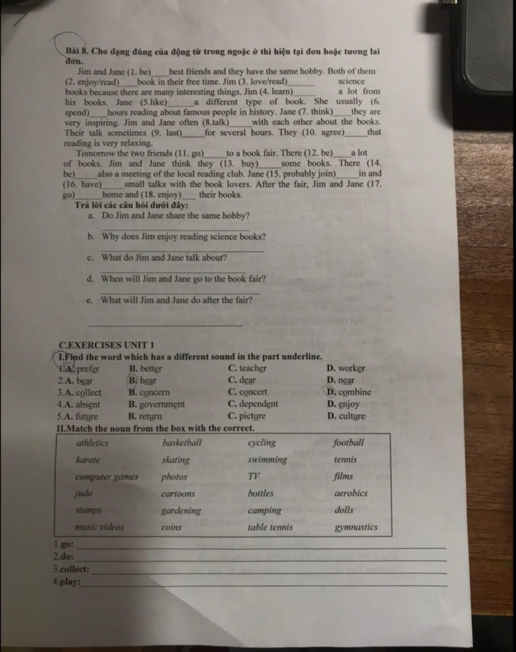 Bài 8. Cho dạng đúng của đong từ trong ngoặce ở thì hiện tại đơn hoặc tuơng lai