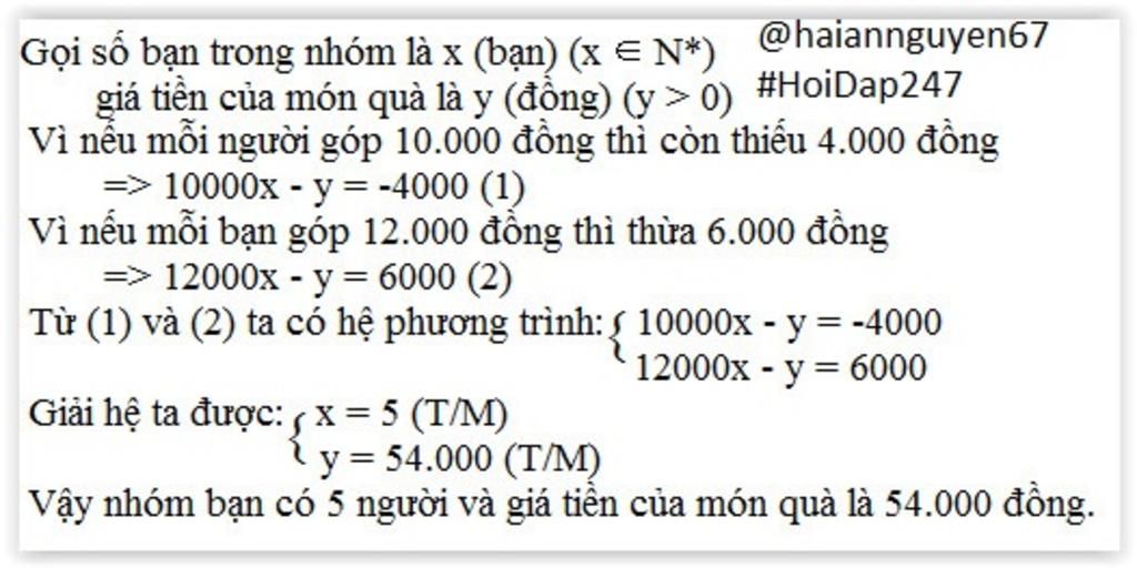 Vậy nhóm có 5 bạn và giá tiền món quà họ muốn tặng là 54000 đồng.