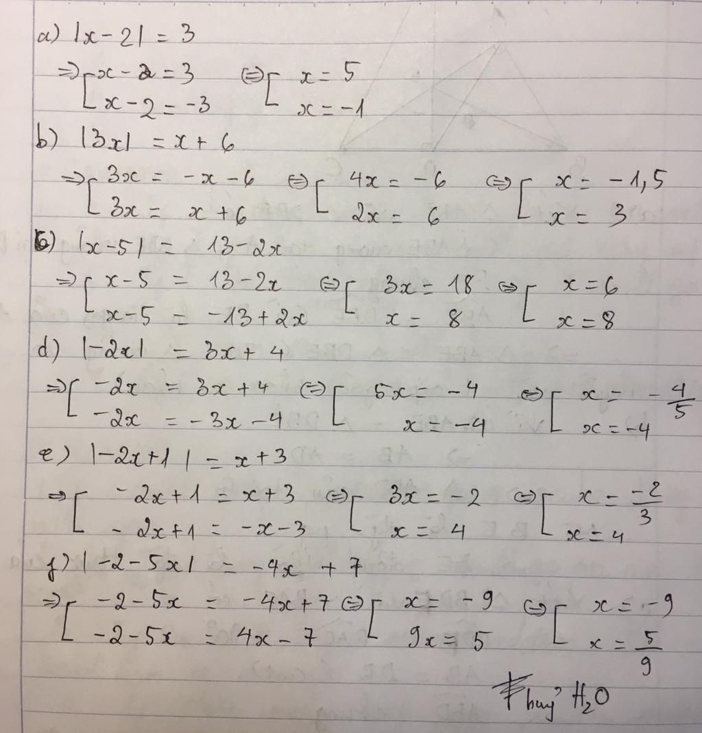 `a) |x-2|=3 <=> x – 2 = 3` hoặc `x – 2 = -3 ó x = 5` hoặc `x = -1`