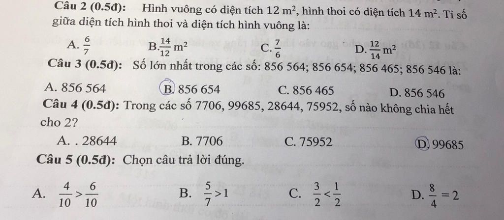 Câu 3 (0.5đ): Số lớn nhất trong các số: 856 564; 856 654; 856 465; 856 546 là:
