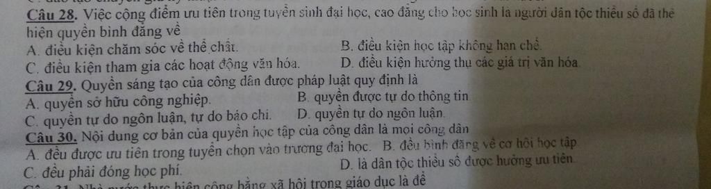 `-` Việc cộng điểm ưu tiên trong tuyển sinh đại học, cao đẳng cho hoc sinh là người dân tộc thiểu số dã thể hiện quyền bình đẳng về `:`
