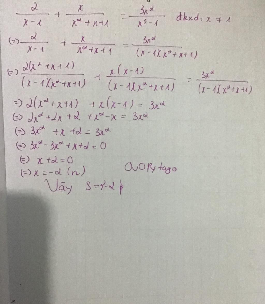 `<=> 2/(x-1) + x/(x^2+x+1) = (3x^2)/((x-1)(x^2+x+1))`