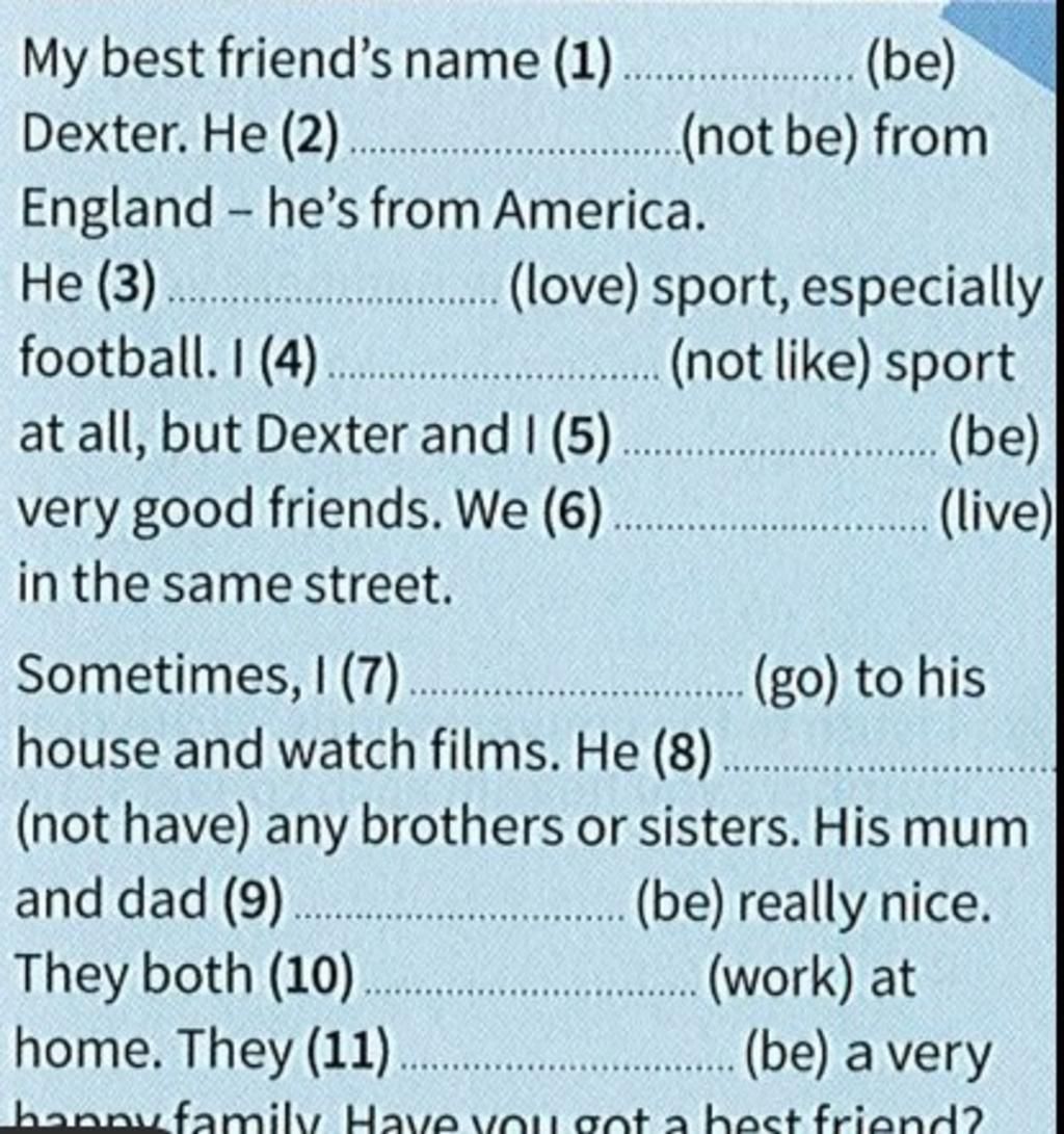 Tên của bạn thân của tôi là Dexter. Cậu ấy không đến từ Anh-cậu ấy đến từ Mỹ. Cậu ấy yêu thể thao, đặc biệt bóng đá. Tôi không thích thể thao ở tát cả các môn, nhưng Dexter và tôi thì là bạn tốt. Chúng tôi sống trong cùng một con phố. Thỉnh thoảng, tôi đến nhà của cậu ấy và xem phim. Cậu ấy không có bất kì anh chị em nào. Mẹ của cậu ấy và ba của cậu ấy thì thực sự tốt. Họ cùng nhau làm việc ở nhà. Họ là một gia đình hạnh phúc. Bạn có một người bạn thân nào không?