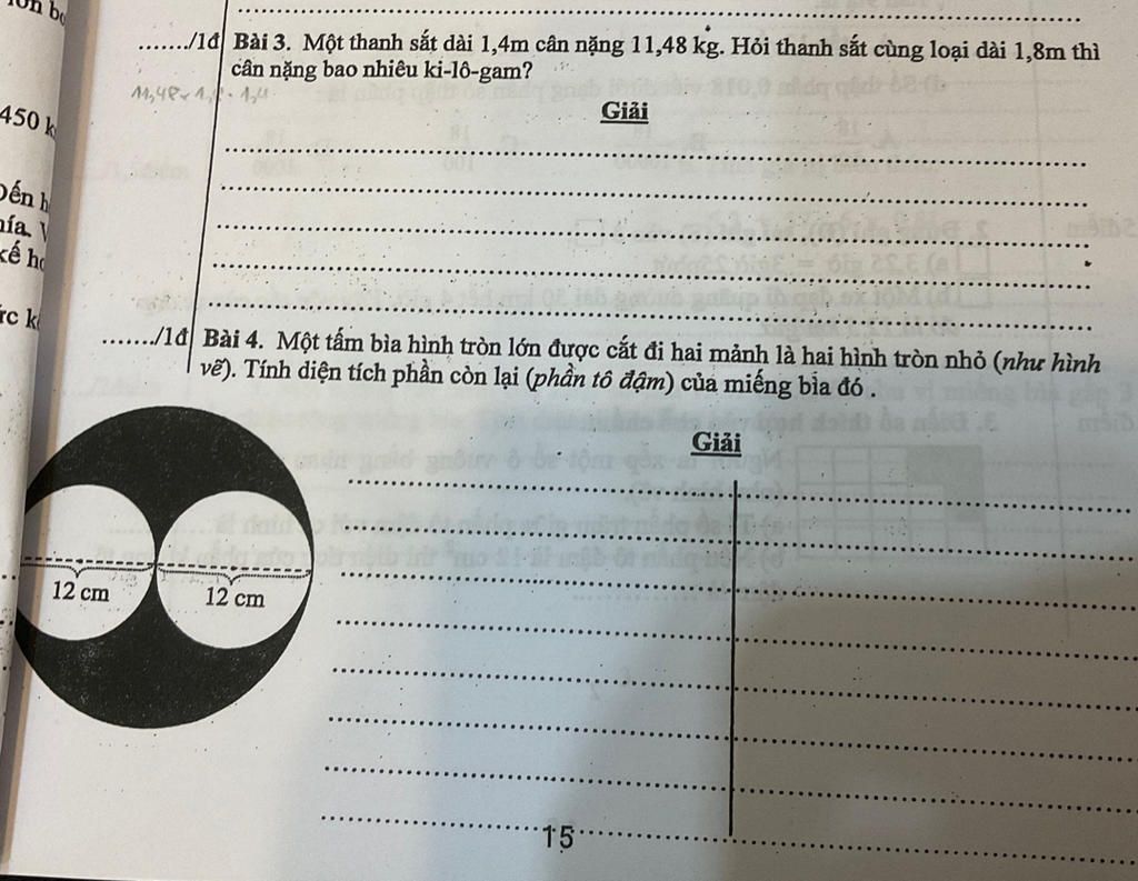 .../1đ Bài 3. Một thanh sắt dài 1,4m cân nặng 11,48 kg. Hỏi thanh sắt cùng loại dài 1,8m thì