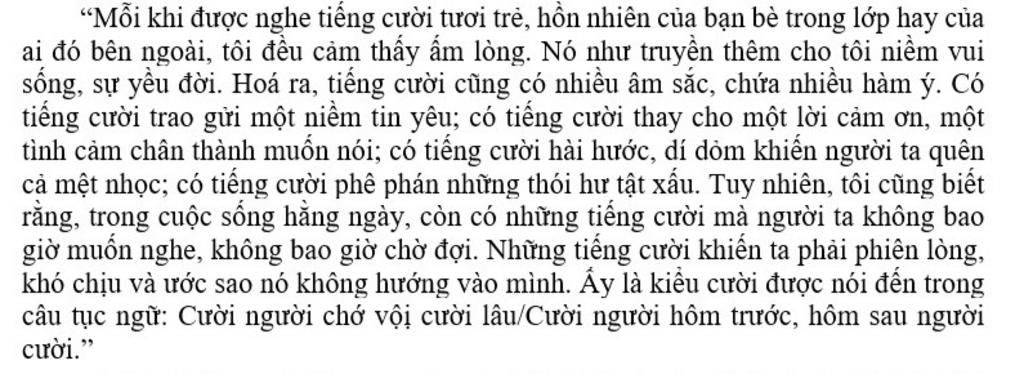 Nội dung của đoạn trích trên là : phê phán những nụ cười nhạo báng, mỉa mai, chê bai người khác và nhấn mạnh thái độ đúng đắn trước những khiếm khuyết của người khác, coi lòng nhân ái là "phương thuốc" trị "căn bệnh" chê bai người khác.