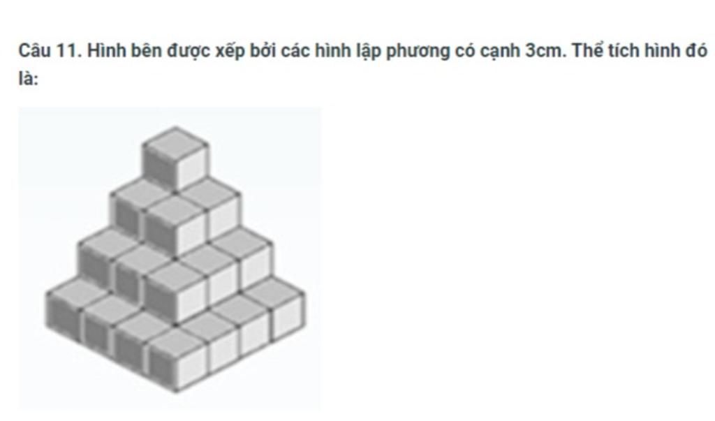 Thể tích mỗi hình lập phương là : 3 x 3 x 3 = 27 (cm³)