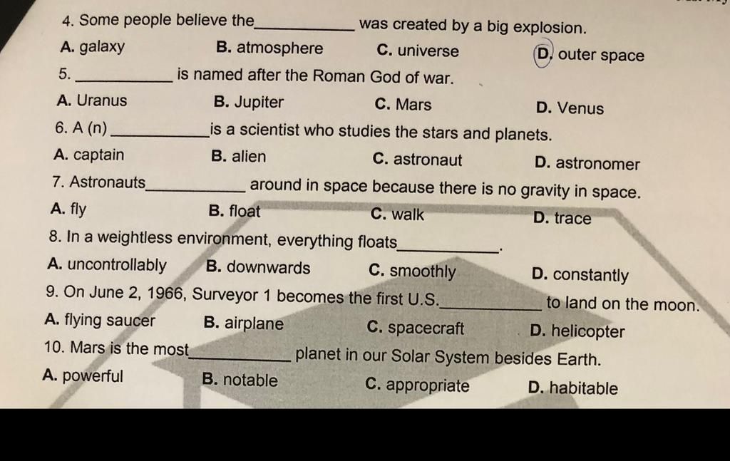 4) C. Universe: vũ trụ ("big explosion" được tạo ra trong vũ trụ chứ ko phải là bên ngoài không gian --> D sai)