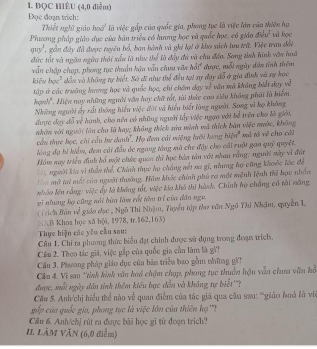 Câu 5: Quan niệm của tác giả qua câu “Giáo hóa là việc gấp của quốc gia, phong tục là việc lớn của thiên hạ” là: